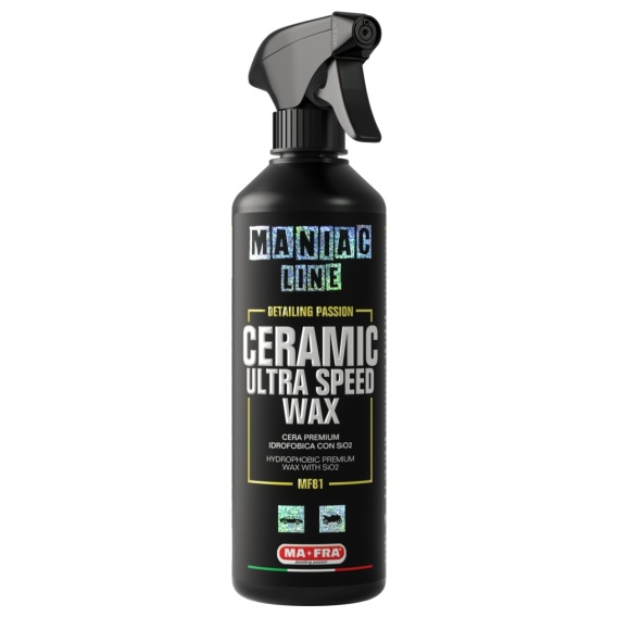 Ceramic Ultra Speed Wax to ceramiczny wosk w sprayu z serii Maniac Line™ włoskiej firmy Mafra. Zawiera superhydrofobowe polimery ceramiczne, które wiążą się z powierzchnią lakieru i tworzą hydrofobową warstwę ochronną o właściwościach samoczyszczących. Zapewnia wyraźny efekt mokrego lakieru, głęboki połysk oraz ochronę nawet do 4 miesięcy.